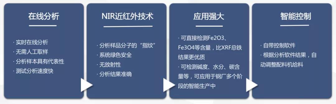 SpectraFlow在线矿石品位智能分析系统以近红外光作为发射源,安全绿色,可实时检测传送带上物料成分:包括总铁、水分、碳含量、碱度等,而且可区分磁铁矿、赤铁矿、菱铁矿等不同类型的铁矿石。它强大的数据库和超快超密集的检测频率,使得实时检测的结果准确、代表性强。同时,它自带控制系统,可根据设定和检测结果,自动调节给料机加料,实现配料过程的的自动化、智能化。极大降低了钢厂铁前系统原料方面及人员波动性风险。可想而知SpectraFlow在线矿石品位智能分析系统的应用,可在钢厂的降本增效和智能化改造中发挥重要的力量!