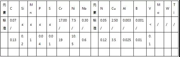 本实验采用1种S30432奥氏体不锈钢,其工艺路线:电炉+AOD+LF+VD+模铸+锻造处理,其化学成分元素符合如下所示的标准成分: